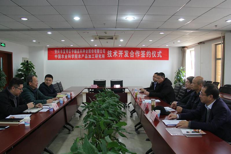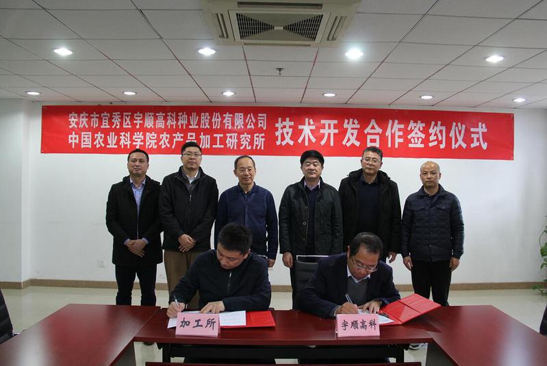 11月27日下午,中國農(nóng)業(yè)科學院農(nóng)產(chǎn)品加工所與宇順高科種業(yè)股份有限公司簽約儀式在北京舉行。中國農(nóng)業(yè)科學院農(nóng)產(chǎn)品加工研究所黨委書記王長江、安慶市宜秀區(qū)區(qū)委書記婁雪松、成果轉(zhuǎn)化處副處長常盛、新資源食品研究中心研究員佟立濤、區(qū)農(nóng)業(yè)農(nóng)村局局長潘緒中、區(qū)文化和旅游局局長何反修、區(qū)林業(yè)局副局長李凱以及公司創(chuàng)始人王發(fā)文等出席。