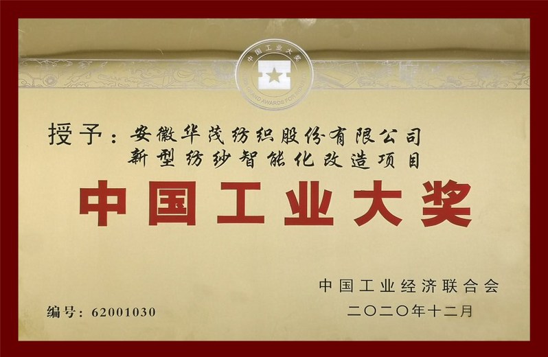 12月27日上午,從北京召開的第六屆中國工業(yè)大獎(jiǎng)發(fā)布會(huì)上傳來喜訊,由安徽華茂申報(bào)的新型紡紗智能化改造項(xiàng)目榮獲“中國工業(yè)大獎(jiǎng)”。中國工業(yè)大獎(jiǎng)是我國工業(yè)領(lǐng)域最高獎(jiǎng)項(xiàng),獎(jiǎng)項(xiàng)的獲得是對(duì)安徽華茂在以制造強(qiáng)國為己任、以產(chǎn)業(yè)報(bào)國為初心,堅(jiān)持自立自強(qiáng),走中國特色創(chuàng)新發(fā)展、綠色發(fā)展新型工業(yè)化道路等方面做出突出成績(jī)的充分肯定。