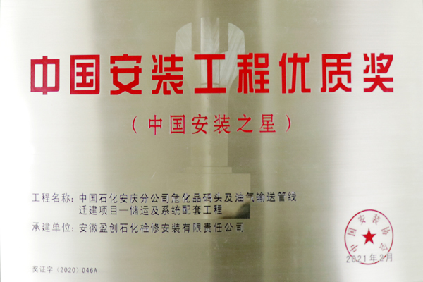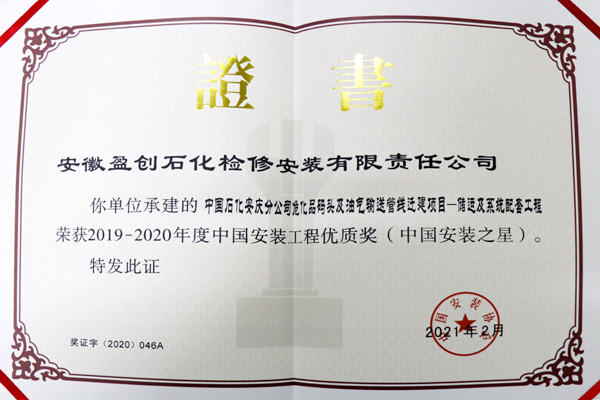 4月22日,2019-2020年度中國(guó)安裝工程優(yōu)質(zhì)獎(jiǎng)(中國(guó)安裝之星)頒獎(jiǎng)大會(huì)在濟(jì)南舉行,由盈創(chuàng)公司承建的中國(guó)石化安慶分公司危化品碼頭及油氣輸送管線遷建項(xiàng)目——儲(chǔ)運(yùn)及系統(tǒng)配套工程 (以下簡(jiǎn)稱8828工程)喜獲中國(guó)安裝工程優(yōu)質(zhì)獎(jiǎng)——“中國(guó)安裝之星”,填補(bǔ)了公司安裝工程領(lǐng)域該獎(jiǎng)項(xiàng)的空白。公司機(jī)動(dòng)部經(jīng)理何忠民獲中國(guó)安裝工程優(yōu)質(zhì)獎(jiǎng)(中國(guó)安裝之星)工程項(xiàng)目經(jīng)理特別榮譽(yù)。