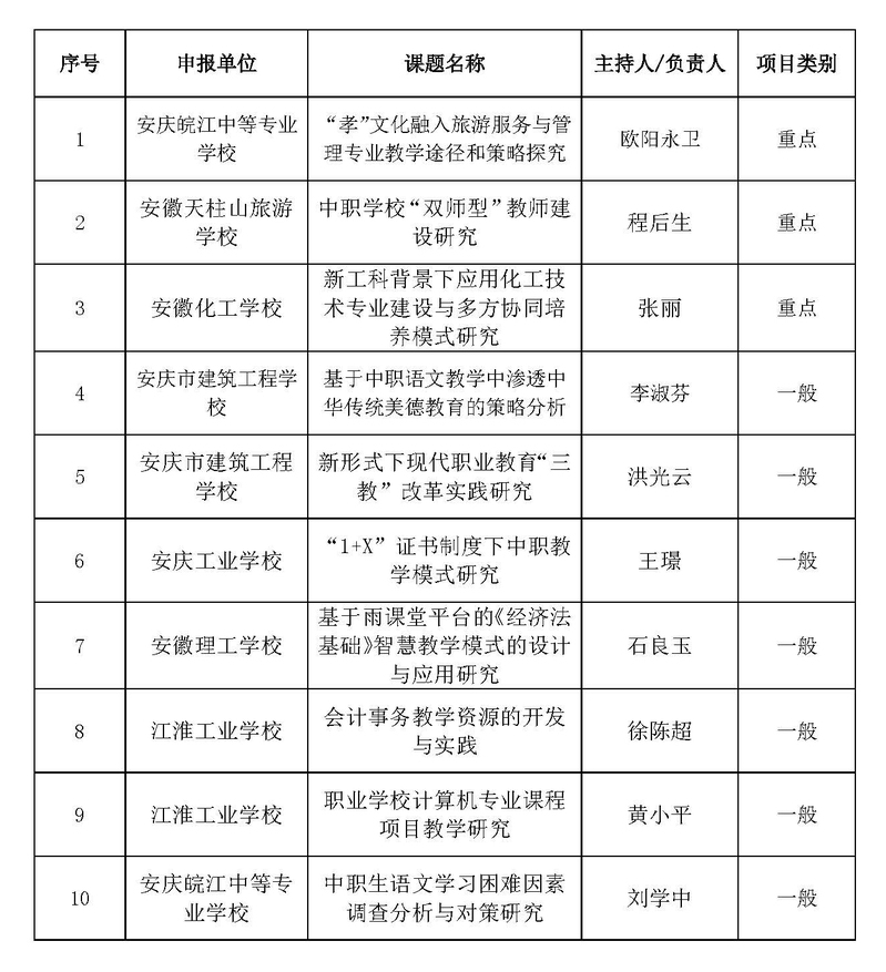 根據(jù)《安慶職業(yè)教育集團(tuán)關(guān)于做好2020年教學(xué)改革研究課題中期檢查及2021年教學(xué)改革研究課題申報(bào)工作的通知》文件精神,經(jīng)個(gè)人申報(bào)、學(xué)校推薦,集團(tuán)秘書處按照相關(guān)程序組織形式審查、專家評審,現(xiàn)對集團(tuán)2021年教學(xué)改革研究課題擬立項(xiàng)名單進(jìn)行公示。