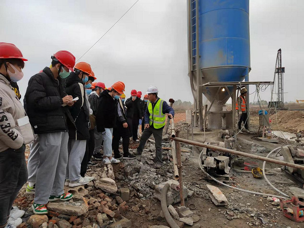 兩個(gè)施工項(xiàng)目分別由中鐵十七局與中鐵十六局承建。項(xiàng)目涵蓋了水泥攪拌樁地基加固、路基施工(土工格柵)、明挖法、隧道臺(tái)階開挖法、隧道模板襯砌等施工工藝。每個(gè)項(xiàng)目現(xiàn)場(chǎng),由項(xiàng)目部工程師分組給同學(xué)們講解各施工流程的技術(shù)要點(diǎn),并且對(duì)同學(xué)們提出的問題給與現(xiàn)場(chǎng)解答。