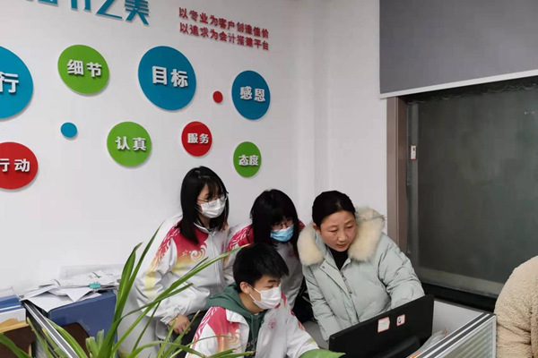 第二天,部分學(xué)生代表來到協(xié)成財(cái)務(wù)咨詢有限公司參觀、座談,三人一組在師傅帶領(lǐng)下上機(jī)操作,現(xiàn)場(chǎng)體驗(yàn)真實(shí)的財(cái)務(wù)和稅收系統(tǒng)。