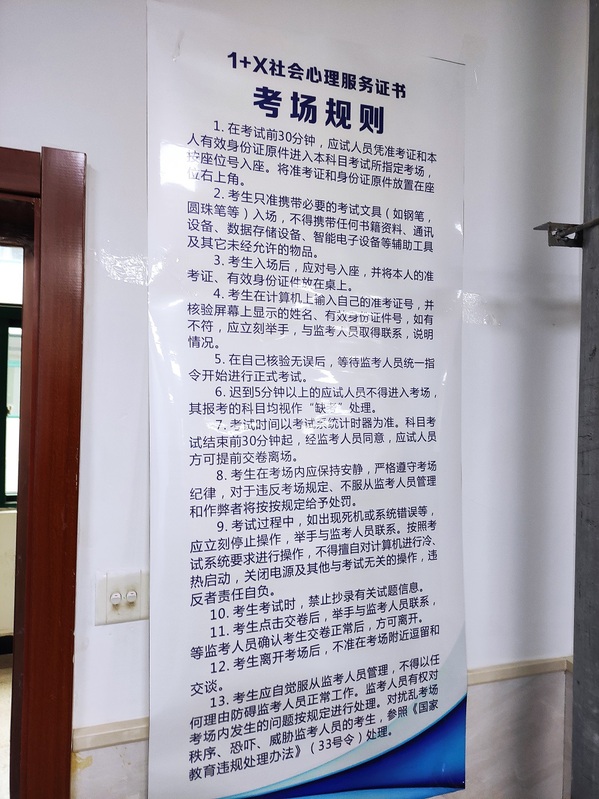 12月25日和12月26日下午,安慶職業(yè)技術(shù)學(xué)院管理服務(wù)學(xué)院“1+X”社會心理服務(wù)(中級)職業(yè)技能等級證書認(rèn)證考試在圖文信息中心508、509機(jī)房順利舉行,2019級、2020級幼兒發(fā)展與健康管理專業(yè)共計(jì)100名同學(xué)參加了考試。考試期間,實(shí)訓(xùn)中心李進(jìn)恩主任、管理服務(wù)學(xué)院院長高潤霞、副院長楊厚松現(xiàn)場督導(dǎo)考務(wù)工作。