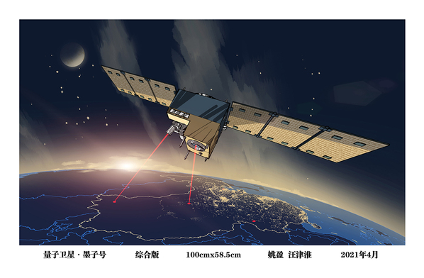 《量子衛(wèi)星·墨子號(hào)》記錄了2016年8月16日成功發(fā)射的“墨子號(hào)”量子科學(xué)實(shí)驗(yàn)衛(wèi)星畫面。“墨子號(hào)”使我國(guó)在世界上首次實(shí)現(xiàn)衛(wèi)星和地面之間的量子通信,構(gòu)建天地一體化的量子保密通信與科學(xué)實(shí)驗(yàn)體系,此前從未在媒體上刊登任何完整的圖片。為了在作品中能真實(shí)展現(xiàn)出“墨子號(hào)”的精彩畫面,作者歷時(shí)四個(gè)多月時(shí)間,花費(fèi)大量精力查閱收集資料素材,手繪修改數(shù)十稿,最終以綜合版畫的形式將量子衛(wèi)星“墨子號(hào)”與地面站建立天地鏈路的場(chǎng)景展現(xiàn)于觀眾面前。