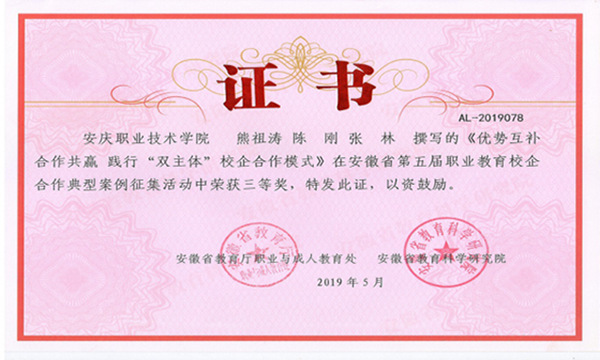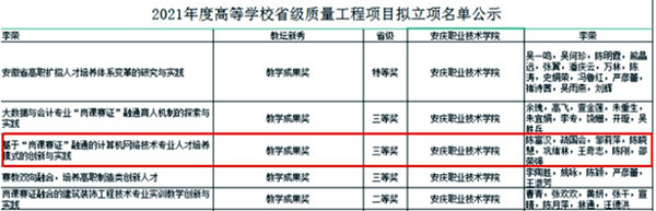 合作4年來,校企聯(lián)合開發(fā)基于工作過程項(xiàng)目化教材9種,并正式出版發(fā)行,推進(jìn)了校企合作專業(yè)教學(xué)內(nèi)容創(chuàng)新;雙方共同申報(bào)的“優(yōu)勢(shì)互補(bǔ)合作共贏踐行‘雙主體’校企合作模式”在安徽省第五屆校企合作典型案例征集活動(dòng)中榮獲三等獎(jiǎng);通過校企聯(lián)合委派指導(dǎo)教師輔導(dǎo)學(xué)生參加各類職業(yè)技能大賽,榮獲安徽省職業(yè)技能大賽一等獎(jiǎng)2項(xiàng),二等獎(jiǎng)3項(xiàng),三等獎(jiǎng)8項(xiàng)的好成績(jī);為進(jìn)一步深化學(xué)生德育教育,2019年校企雙方黨組織共建“思政實(shí)踐教育基地”在學(xué)生的素質(zhì)教育方面獲得多方認(rèn)可;在2021年度安慶職業(yè)技術(shù)學(xué)院優(yōu)秀人才培養(yǎng)方案評(píng)選中,校企共建計(jì)算機(jī)網(wǎng)絡(luò)技術(shù)專業(yè)人才培養(yǎng)方案獲得一等獎(jiǎng);雙方共同研究的“基于‘崗課賽證’融通的計(jì)算機(jī)網(wǎng)絡(luò)技術(shù)專業(yè)人才模式的創(chuàng)新與實(shí)踐”榮獲安徽省教學(xué)成果獎(jiǎng)三等獎(jiǎng)。一項(xiàng)項(xiàng)獎(jiǎng)牌,一項(xiàng)項(xiàng)榮譽(yù),一項(xiàng)項(xiàng)成果充分體現(xiàn)了校企合作成果,推進(jìn)了職業(yè)教育創(chuàng)新發(fā)展步伐。(文、圖:陳 剛 審核:疏國(guó)會(huì))