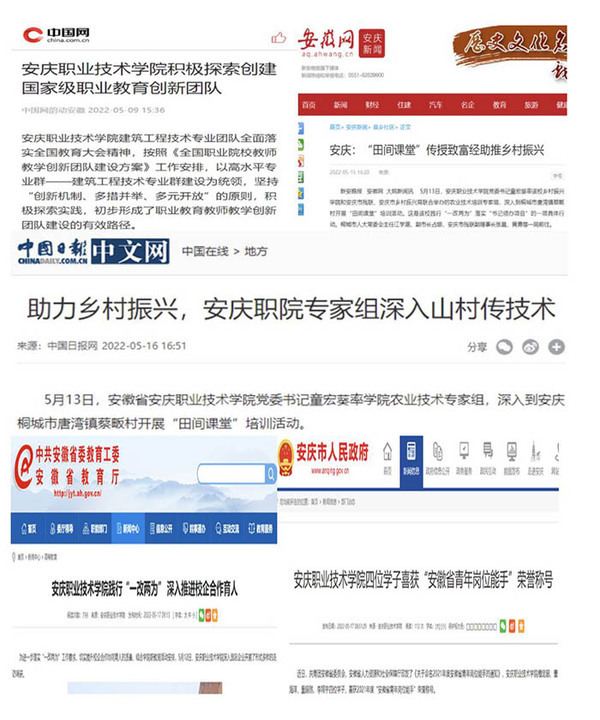 校宣傳部在職教周活動(dòng)開展期間,進(jìn)行了一系列的新聞報(bào)道工作。通過板報(bào)、網(wǎng)站、電視、報(bào)紙、微信、QQ平臺(tái)等形式,著力宣傳報(bào)道職業(yè)教育政策、職業(yè)教育成果、優(yōu)秀畢業(yè)生事跡和職業(yè)教育服務(wù)經(jīng)濟(jì)社會(huì)發(fā)展的典型事例,先后被《中國(guó)日?qǐng)?bào)網(wǎng)》《中國(guó)網(wǎng)》《安徽教育網(wǎng)》《安慶市人民政府網(wǎng)》《掌上安慶》《安慶日?qǐng)?bào)》等轉(zhuǎn)發(fā)報(bào)道。并聯(lián)合團(tuán)委緊扣活動(dòng)周主題,暨中國(guó)共產(chǎn)主義青年團(tuán)成立100周年,開展了“青春心向黨  建功新時(shí)代”快閃微視頻拍攝活動(dòng)。展示職教學(xué)子逐夢(mèng)成長(zhǎng),為生活帶來成功與幸福的成長(zhǎng)足跡,展顯出職教師生積極向上,奮發(fā)進(jìn)取的精神風(fēng)貌和熟練的專業(yè)技能。