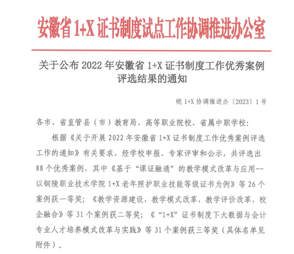 5月18日,安徽省1+X證書制度試點(diǎn)工作協(xié)調(diào)推進(jìn)辦公室公布了2022年安徽省1+X證書制度工作優(yōu)秀案例評(píng)選結(jié)果,安慶職業(yè)技術(shù)學(xué)院在此次評(píng)選中喜獲佳績(jī),榮獲一等獎(jiǎng)1項(xiàng)、二等獎(jiǎng)1項(xiàng)、三等獎(jiǎng)1項(xiàng)。