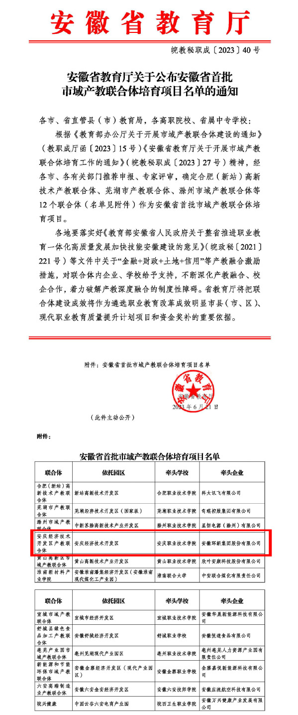 日前,省教育廳公布我省首批市域產(chǎn)教聯(lián)合體培育項(xiàng)目名單,由安慶職業(yè)技術(shù)學(xué)院牽頭申報(bào)的安慶經(jīng)濟(jì)技術(shù)開發(fā)區(qū)產(chǎn)教聯(lián)合體項(xiàng)目以全省第四名成績(jī)獲批立項(xiàng)。安慶市域產(chǎn)教聯(lián)合體是以安慶經(jīng)開區(qū)為依托,以安慶職業(yè)技術(shù)學(xué)院為牽頭學(xué)校,安徽環(huán)新集團(tuán)股份有限公司為牽頭企業(yè),按照“一產(chǎn)一鏈、一園一群”思路組建,將充分發(fā)揮產(chǎn)業(yè)聚合、企業(yè)牽引、學(xué)校主體作用,全力推進(jìn)我市產(chǎn)教深度融合、產(chǎn)學(xué)深入合作,積極探索構(gòu)建政府推動(dòng)、多部門共同參與、多主體協(xié)同、實(shí)體化運(yùn)作的新型產(chǎn)教融合發(fā)展模式。