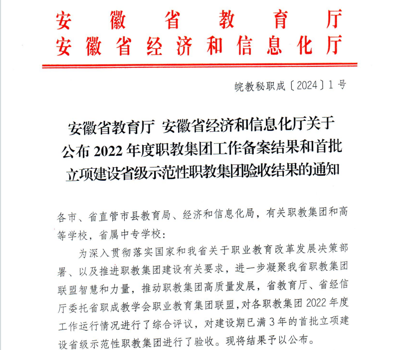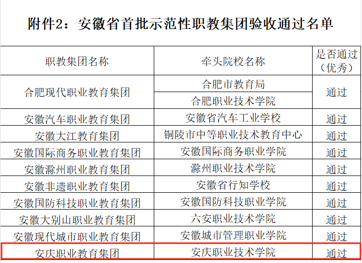 近日,安徽省教育廳、安徽省經(jīng)濟和信息化廳共同發(fā)文通報我省首批立項建設(shè)省級示范性職教集團的10家職教集團驗收結(jié)果,安慶職教集團以優(yōu)秀成績順利通過驗收。