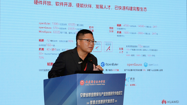 會(huì)上,華為技術(shù)有限公司培訓(xùn)與認(rèn)證部解決方案總監(jiān)李洪臣介紹了華為自主創(chuàng)新產(chǎn)業(yè)生態(tài),并發(fā)布安徽省2024產(chǎn)學(xué)合作創(chuàng)新課題。該課題是在安徽省教育廳指導(dǎo)下,由華為公司聯(lián)合安徽省職業(yè)教育與產(chǎn)業(yè)發(fā)展研究中心、安徽省職業(yè)院校現(xiàn)代產(chǎn)業(yè)學(xué)院管理辦公室,參照教育部產(chǎn)學(xué)合作協(xié)同育人項(xiàng)目設(shè)置內(nèi)容與運(yùn)作機(jī)制在安徽省搭建的人才培養(yǎng)與教研教改平臺(tái)。課題將圍繞華為自主創(chuàng)新產(chǎn)業(yè)發(fā)展與人才培養(yǎng),設(shè)置政策研究、教學(xué)改革、師資培訓(xùn)等課題,吸引高校教師參與自主創(chuàng)新生態(tài)建設(shè),將行業(yè)技術(shù)融入人才培養(yǎng)體系中,進(jìn)而提高辦學(xué)質(zhì)量和產(chǎn)教融合水平。該課題將由安徽省教育廳納入省級(jí)質(zhì)量工程建設(shè)管理。對(duì)順利結(jié)項(xiàng)課題,華為技術(shù)有限公司將給予每項(xiàng)3-5萬元經(jīng)費(fèi)資助。