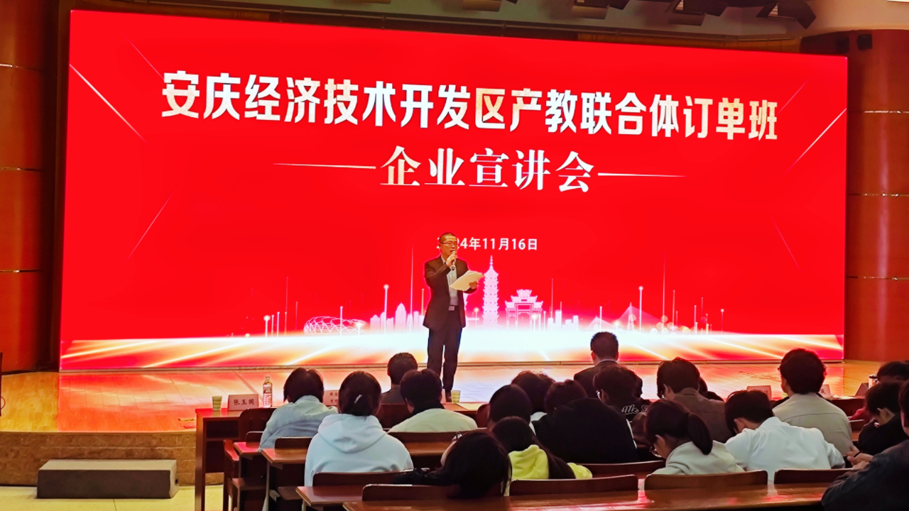 為加強(qiáng)產(chǎn)教融合,助力本地企業(yè)人才招引,扎實(shí)推動安慶經(jīng)開區(qū)產(chǎn)教聯(lián)合體訂單班組建工作,進(jìn)一步提升學(xué)校服務(wù)安慶地方經(jīng)濟(jì)高質(zhì)量發(fā)展能力,2024年11月16日,在安慶職業(yè)技術(shù)學(xué)院圖文信息中心一樓報(bào)告廳,舉行安慶經(jīng)開區(qū)產(chǎn)教聯(lián)合體訂單班宣講會,活動分成上下午共兩場。安慶職院黨委副書記李克讓出席活動,安慶經(jīng)開區(qū)人社局主管方蕾、校企合作辦、招生就業(yè)處、機(jī)電工程學(xué)院相關(guān)負(fù)責(zé)人以及2024級新能源汽車、機(jī)電一體化、工業(yè)機(jī)器人、汽修等專業(yè)班級的輔導(dǎo)員、學(xué)生共計(jì)1000余人參加宣講會。