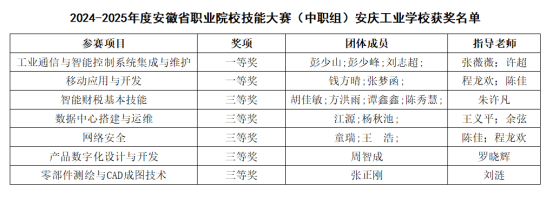 2024-2025年度安徽省職業(yè)院校技能大賽(中職組)于近日落幕。安慶工業(yè)學校參賽師生憑借高超的專業(yè)技能取得優(yōu)異成績,共獲得7個獎項。其中,一等獎2項,三等獎5項,創(chuàng)該校近年來最好成績。