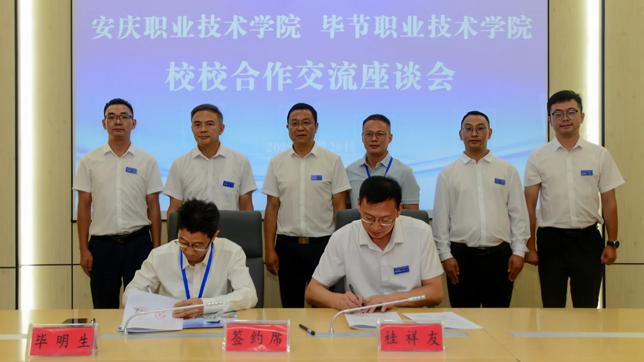 8月28日至29日,安慶職業(yè)技術學院校長畢明生應邀赴畢節(jié)職業(yè)技術學院參加2025中國-東盟教育交流周“校旅結合·職業(yè)教育助力鄉(xiāng)村振興”活動,并與畢節(jié)職業(yè)技術學院簽署框架合作協(xié)議。
